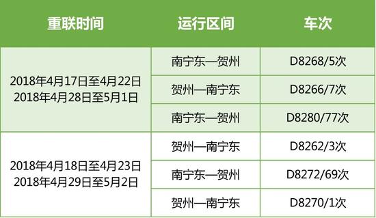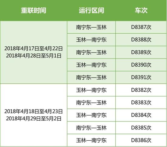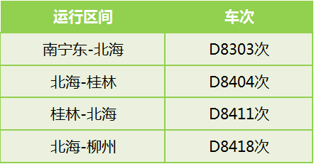 三月三,五一小長假南寧鐵路又加開列車?yán),具體一起來了解下吧! 加開列車信息 2018年4月9日至2018年5月9日 2018年4月10日起至2018年5月10日 2018年4月26日起至另有通知時(shí)止 2018年4月27日起至另有通知時(shí)止 增開南寧~崇左5531/2次 重聯(lián)列車信息 重聯(lián)南寧東~賀州間動(dòng)車組 重聯(lián)南寧東~玉林間動(dòng)車組 詳情請登錄www.12306.cn網(wǎng)站查詢,并以車站當(dāng)日公告為準(zhǔn)! |