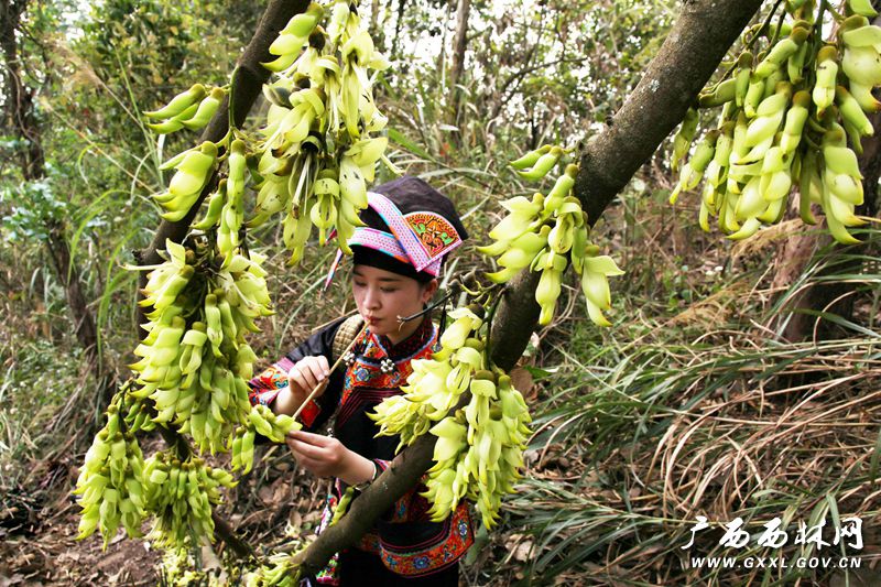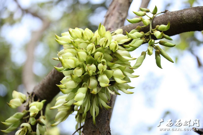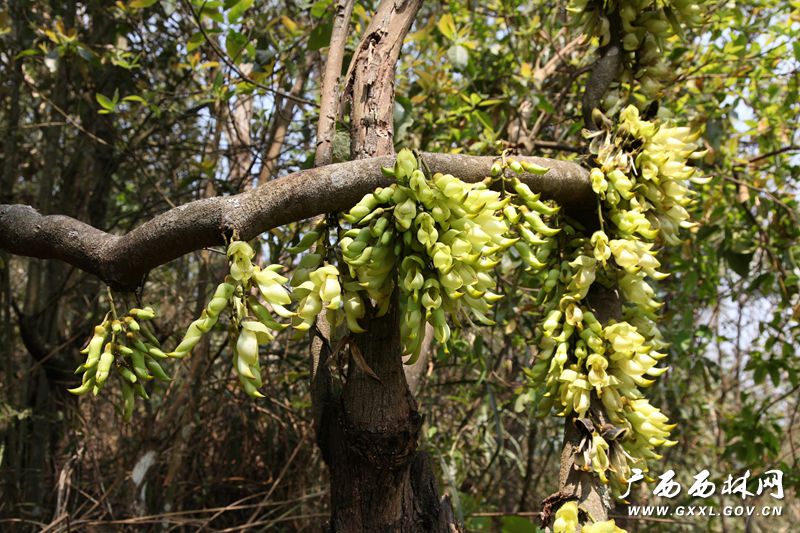 近日來,在西林縣城周邊的樹叢和山谷中開滿了神秘的句町花(“句邪花”)。此花呈米黃色,有四瓣,每串二三十朵,由一青綠色小藤串連,一串串掛于樹間,綿連不斷,給西林縣增添了一道濃濃的春意。 西林縣句町花(“句邪花”)又名老鴉藤花、紅血藤花等,屬于豆科崖豆藤屬的植物,花性喜溫暖濕潤氣候,耐陰耐旱,畏嚴(yán)寒。它是一種季節(jié)性植物,生性強(qiáng)健,生長迅速,攀援力強(qiáng),花期3-5月。花蕊香氣馥郁,堆積有甘甜的汁液,滋味醇厚甘鮮,入口甘帶蜜味,可用小蘆葦枝干進(jìn)行吸喝,常引來路人品賞。 據(jù)悉,“句邪”是“山神之藤”,西林作為句町古國故地,千百年來,當(dāng)?shù)厝罕妼Υ嘶捌涑绨,將它視為美滿和理想的化身而熱情歌頌,也深得人們的贊賞和喜愛。故將此花作為國花。 |