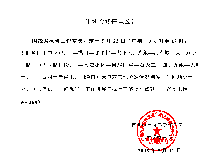 因線路檢修工作需要,定于 5 月 22 日(星期二)6 時至 17 時,龍旺片區(qū)豐寶化肥廠—港口—那平村—大旺七、八組—汽車城(大旺路那平路口至大同路口段)—永安小區(qū)—何屋舊屯—石龍三、四、九組—大旺一、二、四組一帶停電。如遇雷雨天氣或其他特殊情況則停電時間順延一天。(恢復供電時間視當日工作進展情況有可能提前或延時,咨詢電話:966368)。 |