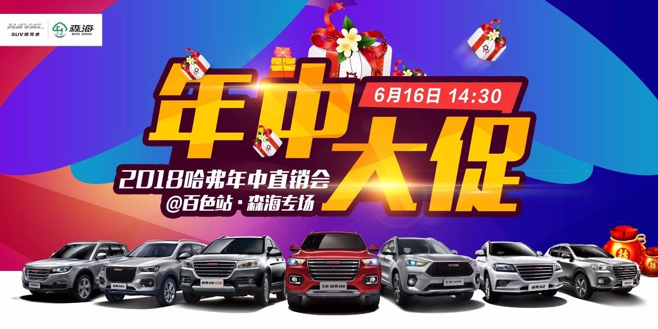6月16日下午14:30,百色森海哈弗4S店 2018哈弗SUV年中大促直銷會(huì) @百色站 大促矩獻(xiàn),限時(shí)團(tuán)購,盛宴來襲 購車享底價(jià),6.16到森海 多重享好禮,6.16到森海 特供享特價(jià),6.16到森海 服務(wù)享實(shí)惠,6.16到森海 【到店禮】 活動(dòng)當(dāng)天到店,立贈(zèng)精美誠意禮一份 【集贊禮】 長(zhǎng)城、哈弗任意車型車主 轉(zhuǎn)發(fā)本文至朋友圈集滿 38個(gè)贊 活動(dòng)當(dāng)天到店,即送常規(guī)保養(yǎng)一次 (每車限領(lǐng)一張保養(yǎng)券) 【訂車禮】 訂車幸運(yùn)抽獎(jiǎng),100%中獎(jiǎng)贏好禮 【特惠禮】 最高鉅惠45000元,年中大促全系讓利 【置換禮】 置換雙重禮遇,最高可享6000元補(bǔ)貼 【金融禮】 按揭購車尊享 最高10萬免息,0利息0首付輕松貸 【折扣禮】 精品回饋,超豪華原廠精品五折大派送 High購盛宴 哈弗 618元購車紅包限時(shí)搶 500元延保券、118元養(yǎng)護(hù)套餐券限時(shí)搶 置換購車雙重禮遇 新車發(fā)布 “國民神車”再出發(fā) 全新哈弗H6豪華型/超豪型駕臨 百色區(qū)域全面上市 全新哈弗H6煥新登場(chǎng) 外觀、內(nèi)飾、動(dòng)力、安全再升級(jí) 雙十佳動(dòng)力組合,有激擎、更省油 哈弗安全聯(lián)盟,鑄就行業(yè)安全新標(biāo)桿 鎧甲安全,出行更放心! 趣味共享 歡樂賽足球,贏競(jìng)技大獎(jiǎng)! 趣味比拼圖,賽出你眼力! 射手秒圈套,百發(fā)百中禮! 更多互動(dòng)好禮,更多精彩歡樂 一切盡在,6月16日百色森海哈弗店 刺激,與您不見不散! |