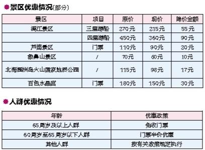 本報(bào)訊(記者 孟娟娟)國慶出游福利來啦!昨日,記者從自治區(qū)物價(jià)局獲悉,根據(jù)中央部署,廣西陸續(xù)降低國有景區(qū)門票價(jià)格。據(jù)統(tǒng)計(jì),截至昨日,全區(qū)已降低或在國慶前降低價(jià)格的景區(qū)共99個(gè),降價(jià)幅度大部分在20%左右,有的甚至達(dá)30%。 今年以來,廣西各級價(jià)格主管部門加快完善景區(qū)門票價(jià)格形成機(jī)制,加強(qiáng)旅游服務(wù)價(jià)格管理,著力做好降低重點(diǎn)國有景區(qū)門票價(jià)格工作。 在9月1日前,廣西分別降低了桂林象山景區(qū)等11個(gè)景區(qū)價(jià)格。9月13日,自治區(qū)物價(jià)局再次下發(fā)緊急通知,要求在今年“十一”黃金周前再降低一批重點(diǎn)國有景區(qū)門票價(jià)格。降價(jià)范圍為重點(diǎn)5A景區(qū)和現(xiàn)行價(jià)格水平較高的4A景區(qū)門票價(jià)格,并積極推動(dòng)其他景區(qū)門票價(jià)格降低。要求降價(jià)幅度原則上不低于20%,景區(qū)交通(游覽觀光車、游船)、索道等票價(jià)偏高的也要降低。 同時(shí),廣西還關(guān)愛老人,落實(shí)老年人門票價(jià)格優(yōu)惠政策。要求實(shí)行政府定價(jià)或指導(dǎo)價(jià)管理的風(fēng)景名勝區(qū)等旅游景區(qū)景點(diǎn),對65周歲及以上老年人免收門票,對60周歲至65周歲以下的老年人實(shí)行門票半價(jià)優(yōu)惠。其他人群價(jià)格優(yōu)惠按有關(guān)政策規(guī)定執(zhí)行。 下一步,廣西還將積極推動(dòng)4A及以下國有景區(qū)降價(jià)。 |