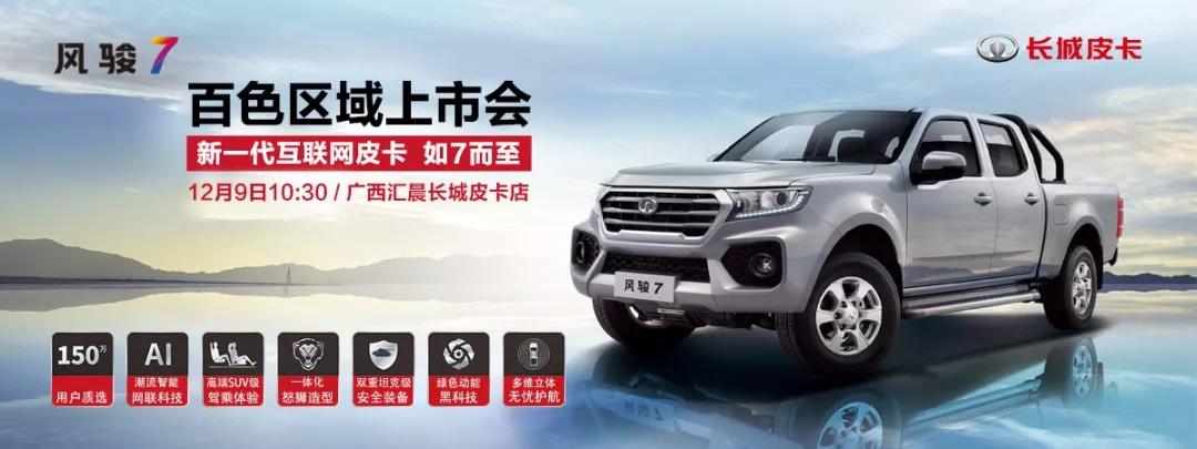 | 新一代互聯(lián)網(wǎng)皮卡 駕臨百色 新一代互聯(lián)網(wǎng)皮卡——風(fēng)駿7,共推出8款車型,價(jià)格區(qū)間為9.58萬(wàn)元~11.78萬(wàn)元。風(fēng)駿7在造型設(shè)計(jì)、動(dòng)力、安全等配置,尤其是智能網(wǎng)聯(lián)技術(shù)的應(yīng)用上達(dá)到全面領(lǐng)先,搭載全新智能語(yǔ)音交互系統(tǒng),打造新一代互聯(lián)網(wǎng)皮卡。如今,風(fēng)駿7已正式駕臨百色,12月9日,百色森海誠(chéng)邀您蒞臨風(fēng)駿7百色區(qū)域上市會(huì),親身品鑒,一睹“新一代互聯(lián)網(wǎng)皮卡”的風(fēng)采。 12月9日上午10:30,廣西匯晨長(zhǎng)城皮卡專營(yíng)店, 誠(chéng)邀品鑒!簽到有禮、水果點(diǎn)心、現(xiàn)金紅包、互動(dòng)好禮…… 風(fēng)駿7丨看我 送福利 風(fēng)駿7 車型政策——享按揭1年0利息,最高3000元置換補(bǔ)貼 風(fēng)駿5、風(fēng)駿6 車型政策——享3000元抵6000元,按揭1年0利息 風(fēng)駿7丨看我 展風(fēng)采 |