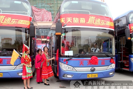 4月30日,百色旅游直通車首發(fā)儀式在百色市高鐵站進(jìn)站大道南大世紀(jì)廣場(chǎng)舉行。記者從百色市旅游發(fā)展委員會(huì)了解到,從4月30日起,游客可以在百色城區(qū)乘車直達(dá)大王嶺、田州古城、通靈大峽谷、舊州、鵝泉、樂(lè)業(yè)大石圍天坑等景區(qū)。 首發(fā)儀式當(dāng)天,100多名游客坐上直通車,直達(dá)旅游景區(qū)門口!奥糜沃蓖ㄜ噷>開通對(duì)游客來(lái)說(shuō)非常有利,我們一下高鐵就可以乘車到達(dá)景區(qū),省去了轉(zhuǎn)車、找路的麻煩!崩"五一"假期到百色旅游的游客黃雷說(shuō)。據(jù)了解,旅游專線直通車開通后,將進(jìn)一步完善百色旅游公共服務(wù)功能,改善百色旅游交通條件,為游客提供便捷的旅游交通服務(wù)。 |