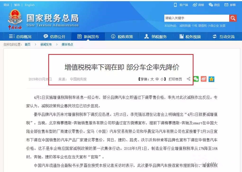 3月5日,政府工作報(bào)告宣布深化增值稅改革,今年將制造業(yè)等行業(yè)現(xiàn)行16%的稅率降至13%,該政策于今年4月1日正式實(shí)施。 近日,國家稅務(wù)總局官網(wǎng)上公布一則消息:部分品牌汽車立即通過下調(diào)零售價(jià)格,率先對(duì)此次減稅作出反應(yīng),減稅政策利企惠民效應(yīng)已初步顯現(xiàn)。 1 增值稅下調(diào)3%,車企官降 沒買車的恭喜了! 3月15日,總理在記者會(huì)上明確提出“4月1日就要減增值稅”。當(dāng)晚,北京梅賽德斯-奔馳銷售服務(wù)有限公司即通過官方微博宣布,提前下調(diào)梅賽德斯-奔馳及smart在中國大陸全部在售車型的廠商建議零售價(jià)。寶馬(中國)汽車貿(mào)易有限公司和華晨寶馬汽車有限公司也緊接著于3月16日宣布下調(diào)在中國銷售的汽車產(chǎn)品廠家建議零售價(jià)。同日,捷豹、路虎、沃爾沃和林肯等品牌也宣布下調(diào)在華銷售汽車價(jià)格。這不是車企響應(yīng)國家減稅政策的第一次集體行動(dòng)。2018年5月1日,制造業(yè)等行業(yè)增值稅稅率從17%降至16%時(shí),奔馳、捷豹等車企也在當(dāng)天宣布“官降”。 我們來看下此次降價(jià)的都有哪些車子: ![]() 來源:界面新聞、數(shù)據(jù)線 增值稅下調(diào)三個(gè)點(diǎn),車價(jià)能降多少?以捷豹XFL精英版為例,調(diào)價(jià)前官方指導(dǎo)價(jià)41.58萬元,在非含稅價(jià)不變的情況下,增值稅由16%下調(diào)至13%,則該車型含稅價(jià)的下調(diào)幅度約為2.59%。 在此次下調(diào)價(jià)格的89款車型中,超5成(48款)的降價(jià)幅度低于2.59%。另有四成(39款)降價(jià)幅度高于2.59%。 ![]() ![]() 來源:界面新聞、數(shù)據(jù)線 2 增值稅憑什么影響豪車價(jià)格? 增值稅,是以商品(含應(yīng)稅勞務(wù))在流轉(zhuǎn)過程中產(chǎn)生的增值額作為計(jì)稅依據(jù)而征收的一種流轉(zhuǎn)稅。 增值稅是價(jià)外稅,采取稅款抵扣制度,稅款隨著商品流通而轉(zhuǎn)移,會(huì)計(jì)上體現(xiàn)為終端消費(fèi)者承擔(dān)所有稅款。消費(fèi)者在購買汽車時(shí),發(fā)票上寫得很清楚,價(jià)格多少,稅多少,價(jià)稅合計(jì)多少,這其中的稅,指的就是增值稅。增值稅稅率下調(diào),可以說是直接減輕了消費(fèi)者的負(fù)擔(dān)。 增值稅是中國最主要的稅種之一,也是最大的稅種。簡單點(diǎn)理解,買車時(shí)的官方指導(dǎo)價(jià)就已經(jīng)是包含增值稅的價(jià)格。 明白增值稅的含義后,就能很好解釋最近各大汽車品牌都官降的緣由了:稅率降低,車企生產(chǎn)成本隨之下降,汽車官方指導(dǎo)價(jià)自然也降低。2018年5月1日起,增值稅率已從17%下調(diào)至16%,2019年4月1日起再次下調(diào)至13%。 汽車行業(yè)是受此次增值稅降稅率政策影響較大的行業(yè),特別是對(duì)售價(jià)高、需求彈性強(qiáng)的豪華品牌汽車而言,這種影響尤為明顯。所以每逢增值稅稅率降低,車企的反應(yīng)最大! 經(jīng)過測(cè)算,增值稅稅率降低3%,10萬的車在理想情況下可以降2500元! 增值稅稅率降低到13%后 減少的稅額為 868207*(16%-13%)=2586! 增值稅降稅率是否會(huì)帶動(dòng)某類商品降價(jià),具體會(huì)降價(jià)多少,是由該類商品的市場競爭程度和相關(guān)企業(yè)品牌影響力決定的。但此次增值稅降稅率無疑為企業(yè)提供了降價(jià)空間,可以預(yù)計(jì),將會(huì)有更多的企業(yè)、更多的商品加入到降價(jià)的行列中來。 3 增值稅下調(diào) 對(duì)我們的錢袋子有什么影響? 其實(shí),增值稅下調(diào)的影響不僅僅是買車,也不僅僅對(duì)企業(yè)有影響,更對(duì)我們生活的很多方面都有影響,很多商品的價(jià)格都將降低。具體的影響:r> ![]() ![]() |