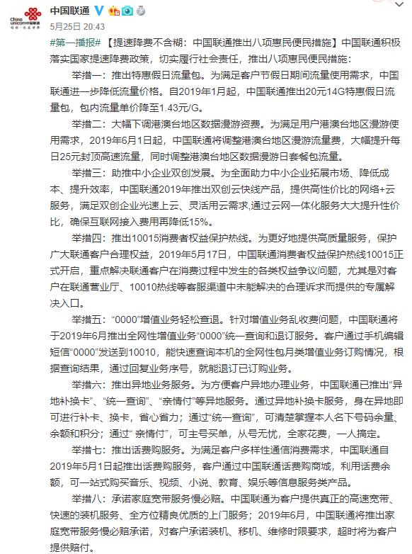 根據(jù)國家“提速降價”的號召,三大運營商在這兩年來均紛紛推動資費下調(diào),和4G網(wǎng)絡(luò)推出早期相比,實際上我們能用到的網(wǎng)絡(luò)資費套餐已經(jīng)劃算了不少。在5G網(wǎng)絡(luò)即將到來之際,4G網(wǎng)絡(luò)的資費的性價比也來到了最高點。 5月25日晚,中國聯(lián)通突然發(fā)出公告,宣布八項便民措施。這八項措施雖然和資費套餐沒有直接關(guān)聯(lián),但顯然能在一定程度上提升中國聯(lián)通用戶的網(wǎng)絡(luò)使用體驗,不失為一個提升滿意度的好舉措。 中國聯(lián)通方面表示,積極落實國家提速降費政策,切實履行社會責(zé)任,推出八項惠民便民措施,具體如下: 1、推出特惠假日流量包 為滿足客戶節(jié)假日期間流量使用需求,中國聯(lián)通進一步降低流量價格。自2019年1月起,中國聯(lián)通推出20元14G特惠假日流量包,包內(nèi)流量單價降至1.43元/G。 2、大幅下調(diào)港澳臺地區(qū)數(shù)據(jù)漫游資費 為滿足用戶港澳臺地區(qū)漫游使用需求,2019年6月1日起,中國聯(lián)通將調(diào)整港澳臺地區(qū)漫游流量費,大幅提升每日25元封頂高速流量,同時調(diào)整港澳臺地區(qū)數(shù)據(jù)漫游日套餐包流量。 3、助推中小企業(yè)雙創(chuàng)發(fā)展 為全面助力中小企業(yè)拓展市場、降低成本、提升效率,中國聯(lián)通2019年推出雙創(chuàng)云快線產(chǎn)品,提供高性價比的網(wǎng)絡(luò)+云服務(wù),滿足雙創(chuàng)企業(yè)光速上云、靈活用云需求,通過云網(wǎng)一體化服務(wù)大大提升性價比,確保互聯(lián)網(wǎng)接入費用再降低15%。 4、推出10015消費者權(quán)益保護熱線 為更好地提供高質(zhì)量服務(wù),保護廣大聯(lián)通客戶合理權(quán)益,2019年5月17日,中國聯(lián)通消費者權(quán)益保護熱線10015正式開啟,重點解決聯(lián)通客戶在消費過程中發(fā)生的各類權(quán)益爭議問題,尤其是對客戶在聯(lián)通營業(yè)廳、10010熱線等客服渠道中未能解決的合理訴求而提供的專屬解決入口。 5、“0000”增值業(yè)務(wù)輕松查退 針對增值業(yè)務(wù)亂收費問題,中國聯(lián)通將于2019年6月推出全網(wǎng)性增值業(yè)務(wù)“0000”統(tǒng)一查詢和退訂服務(wù)?蛻敉ㄟ^手機編輯短信“0000”發(fā)送到10010,能快速查詢本機的全網(wǎng)性包月類增值業(yè)務(wù)訂購情況,根據(jù)查詢結(jié)果,通過回復(fù)業(yè)務(wù)序號,就能退訂已訂購業(yè)務(wù)。 6、推出異地業(yè)務(wù)服務(wù) 為方便客戶異地辦理業(yè)務(wù),中國聯(lián)通已推出“異地補換卡”、“統(tǒng)一查詢”、“親情付”等異地服務(wù)。通過異地補換卡服務(wù),身在異地即可進行補卡、換卡,省心省力;通過“統(tǒng)一查詢”,可清楚掌握本人名下號碼余量、余額和積分;通過“ 親情付”,可主號買單,從號無憂,全家花費,一人搞定。 7、推出話費購服務(wù) 為滿足客戶多樣性通信消費需求,中國聯(lián)通自2019年5月1日起推出話費購服務(wù),客戶通過中國聯(lián)通話費購商城,利用話費余額,可一站式購買音樂、視頻、小說、教育、娛樂等信息服務(wù)類產(chǎn)品。 8、承諾家庭寬帶服務(wù)慢必賠 中國聯(lián)通為客戶提供真正的高速寬帶、快速的裝機服務(wù)、全方位精良優(yōu)質(zhì)的上門服務(wù);2019年6月,中國聯(lián)通將推出家庭寬帶服務(wù)慢必賠承諾,對客戶承諾裝機、移機、維修時限要求,超時將為客戶提供賠付。 對于這8項措施,網(wǎng)友紛紛留言表示支持,有博主甚至迫不及待要從移動轉(zhuǎn)向聯(lián)通。 聯(lián)通表示,始終牢記使命,用心履行企業(yè)責(zé)任,未來將推出更多惠民便民舉措,建設(shè)精品網(wǎng)絡(luò),降低資費水平,提升服務(wù)質(zhì)量,以實實在在的企業(yè)行動,提升廣大客戶的幸福感。 |