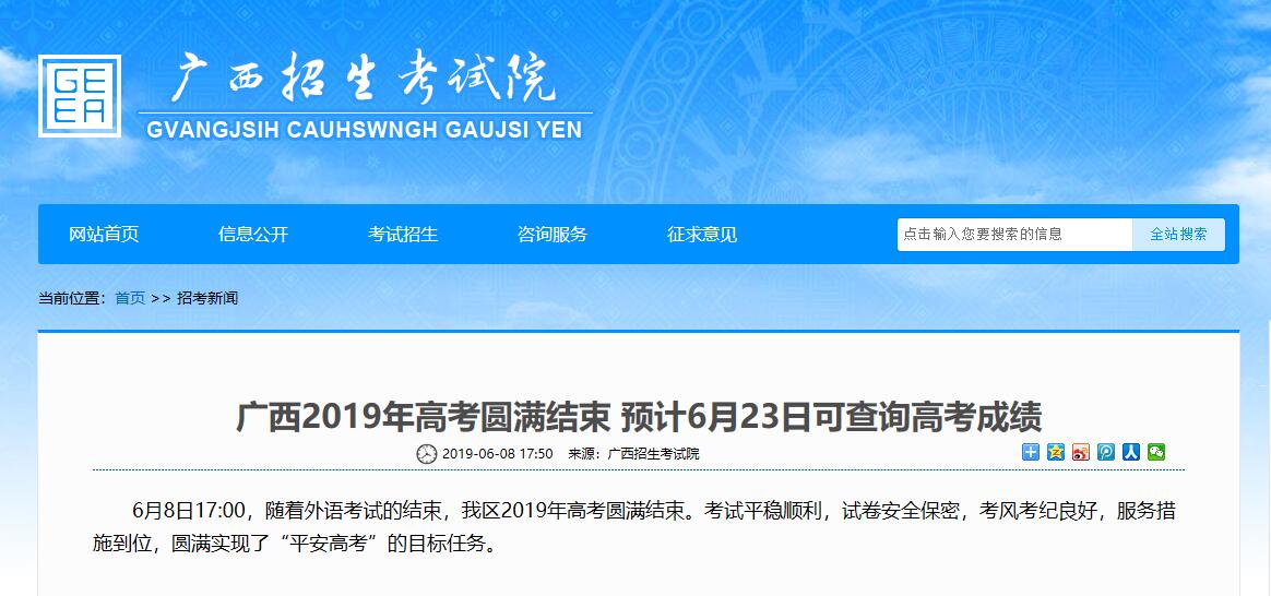 6月8日17:00,隨著外語考試的結(jié)束,我區(qū)2019年高考圓滿結(jié)束?荚嚻椒(wěn)順利,試卷安全保密,考風(fēng)考紀(jì)良好,服務(wù)措施到位,圓滿實(shí)現(xiàn)了“平安高考”的目標(biāo)任務(wù)。 預(yù)計6月23日可查詢高考成績 廣西招生考試院將于6月9日起組織高考評卷工作,預(yù)計6月23日對考生開放高考成績查詢通道,并公布錄取最低控制分?jǐn)?shù)線。屆時考生可查詢高考成績,請考生密切關(guān)注廣西招生考試院官網(wǎng)(http://www.gxeea.cn)、官方微博、官方微信發(fā)布的信息,以便及時了解最新情況。 預(yù)計6月24日可填報高考志愿 今年高考招生計劃編制工作正在審核中,預(yù)計6月24日至28日,廣西招生考試院將開通志愿填報系統(tǒng),考生將可以進(jìn)行本科提前批、高職高專提前批志愿填報。 6月25日至26日舉辦招生咨詢會 廣西招生考試院將于6月25日至26日在南寧國際會展中心舉辦廣西2019年普通高校招生咨詢會,屆時將有區(qū)內(nèi)外數(shù)百所高校參加招生宣傳,廣西招生考試院也將在現(xiàn)場接受考生和家長有關(guān)招生錄取政策的咨詢,為考生填報志愿答疑解惑?忌图议L可根據(jù)各自需要自愿參加咨詢。 溫馨提示廣大考生家長 廣西招生考試院提醒考生,高考過后應(yīng)注意調(diào)節(jié)心情,適度放松,外出游玩時要注意人身安全。在考后放松的同時,考生也應(yīng)提前了解我區(qū)今年普通高等學(xué)校招生錄取的相關(guān)規(guī)定,熟悉志愿填報和投檔錄取相關(guān)政策、流程,以及各高校招生章程,為填報志愿做好充分準(zhǔn)備。在此期間,社會一些不法分子可能利用考生和家長們迫切知曉高考成績及希望上好大學(xué)的心理進(jìn)行招生詐騙,請考生和家長提高警惕,謹(jǐn)防上當(dāng)受騙。 |