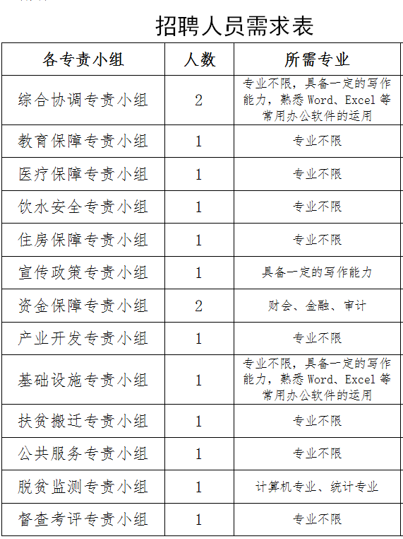 百色市脫貧攻堅戰(zhàn)指揮部是百色市委、市人民政府負責(zé)協(xié)調(diào)全市脫貧攻堅工作的專門機構(gòu)。因工作需要,經(jīng)市委、市人民政府同意,決定面向社會公開招聘工作人員15名,現(xiàn)將招聘事項公告如下: 一、招聘原則 按照“公平、公正、公開、擇優(yōu)”的原則,堅持德才兼?zhèn)涞臉藴,通過面試、體檢、考核等程序擇優(yōu)確定聘用人員。 二、應(yīng)聘基本條件 。ㄒ唬┳袷刂腥A人民共和國憲法和法律,品德端正,誠實守信,無任何不良記錄和違法違紀行為; (二)有符合招聘職位所需的專業(yè)要求,熟練電腦操作,有較好的文字、語言表達能力; (三)身體健康,責(zé)任心強,吃苦耐勞,具有奉獻精神,能熱心為群眾服務(wù),有較強溝通能力和一定的組織協(xié)調(diào)能力; 。ㄋ模┚哂腥罩破胀ǜ叩仍盒.厴I(yè)生大學(xué)專科以上學(xué)歷,綜合成績優(yōu)良,按期獲得相應(yīng)學(xué)歷學(xué)位證書; 。ㄎ澹┠挲g在18周歲以上、32周歲以下(1987年6月30日至2001年6月30日期間出生)。 三、試用期和待遇 試用期3個月,通過試用期后簽訂正式勞動合同。聘用月工資1800元,并按國家有關(guān)規(guī)定辦理社會保險等手續(xù),享受國家和自治區(qū)規(guī)定節(jié)假日休假。聘用期滿后根據(jù)工作表現(xiàn),確定續(xù)聘或解聘。 四、報名時間及方式 。ㄒ唬﹫竺麜r間:2019年8月2日—2019年8月16日。 (二)報名方式:將個人簡歷發(fā)到百色市脫貧攻堅戰(zhàn)指揮部綜合協(xié)調(diào)專責(zé)小組郵箱bssfpgj@126.com,或攜帶報名表到百色市脫貧攻堅戰(zhàn)指揮部綜合協(xié)調(diào)專責(zé)小組(百色市東洲大道19號,百色體育中心內(nèi))。報名表須有近期免冠照片,并附上最高學(xué)歷和學(xué)位證書、身份證等掃描件(復(fù)印件)及個人近三年成果,經(jīng)初步審核后通知面試。 咨詢電話:百色市脫貧攻堅戰(zhàn)指揮部綜合協(xié)調(diào)專責(zé)小組 聯(lián)系人:羅朝府 聯(lián)系電話:0776—2862016 百色市脫貧攻堅戰(zhàn)指揮部 綜合協(xié)調(diào)專責(zé)小組 2019年8月2日 |