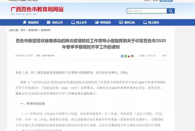 4月15日,百色市新冠肺炎疫情防控指揮部印發(fā)《百色市新型冠狀病毒感染的肺炎疫情防控工作領(lǐng)導(dǎo)小組指揮部關(guān)于印發(fā)百色市2020年春季學(xué)期錯(cuò)時(shí)開學(xué)工作的通知》(百新冠防指辦〔2020〕75號),公布我市中小學(xué)2020年春季學(xué)期開學(xué)時(shí)間安排。 以下是通知全文: 百色市新型冠狀病毒感染的肺炎疫情防控工作領(lǐng)導(dǎo)小組指揮部關(guān)于印發(fā)百色市2020年春季學(xué)期錯(cuò)時(shí)開學(xué)工作的通知 各縣(市、區(qū))新型冠肺炎疫情防控工作領(lǐng)導(dǎo)小組指揮部,市直各有關(guān)單位、學(xué)校: 根據(jù)《廣西壯族自治區(qū)新型冠狀病毒感染的肺炎疫情防控工作領(lǐng)導(dǎo)小組指揮部關(guān)于做好2020年春季學(xué)期錯(cuò)時(shí)開學(xué)工作的通知》(桂新冠防指〔2020〕110號)部署要求,為確保全市2020年春季學(xué)期師生安全、順利返校,現(xiàn)就百色市2020年春季學(xué)期錯(cuò)時(shí)開學(xué)工作相關(guān)事宜通知如下。 一、開學(xué)時(shí)間安排 (一)開學(xué)時(shí)間:4月22日小學(xué)四至六年級、初中和普通高中一至二年級、中職學(xué)校 (含技工學(xué)校,下同)開學(xué),小學(xué)一至三年級、特殊教育學(xué)校、幼兒園按照5月6日來進(jìn)行開學(xué)準(zhǔn)備(具體時(shí)間另行通知)。市屬高校開學(xué)方案經(jīng)本市疫情防控指揮部批準(zhǔn)后報(bào)自治區(qū)教育廳備案,自治區(qū)直屬高校開學(xué)方案經(jīng)自治區(qū)教育廳統(tǒng)籌后,報(bào)自治區(qū)疫情防控指揮部批準(zhǔn)。 (二)返校時(shí)間:除因疫情防控要求暫不能返崗的教職工外,小學(xué)、初中、高中、中職學(xué)校全體教職員工包括行政管理人員、校醫(yī)等要在4月16日前提前返崗;寄宿制學(xué)校學(xué)生于4月21日返校。特殊教育學(xué)校、幼兒園全體教職員工于5月1日前提前返崗。 二、重點(diǎn)工作安排 按照自治區(qū)統(tǒng)一部署,各縣(市、區(qū))、各相關(guān)學(xué)校要認(rèn)真落實(shí)自治區(qū)新冠肺炎疫情防控指揮部印發(fā)的《學(xué)校疫情防控工作“十嚴(yán)格”》《廣西中小學(xué)校新冠肺炎疫情防控實(shí)施方案》以及百色市新冠肺炎疫情防控工作領(lǐng)導(dǎo)小組指揮部印發(fā)的《百色市中小學(xué)(幼兒園)新冠肺炎疫情防控工作方案》等5個(gè)工作方案要求,加強(qiáng)校園管理和日常疫情防控,要確保師生返校后不發(fā)生疫情。師生返校工作參照《百色市2020年春季學(xué)期初三、高三年級師生返校工作方案》執(zhí)行。重點(diǎn)做好以下幾項(xiàng)工作: (一)專業(yè)培訓(xùn)。小學(xué)、中職學(xué)校在4月17前,特殊教育學(xué)校、幼兒園于4月24日前對教職員工進(jìn)行疫情防控、消殺規(guī)范、應(yīng)急處置等專業(yè)培訓(xùn)。 (二)應(yīng)急演練。小學(xué)、中職學(xué)校在4月17日前,特殊教育學(xué)校、幼兒園于4月27日前,按照疫情防控工作方案、應(yīng)急預(yù)案、師生返校方案開展應(yīng)急演練。 (三)防疫消殺。自4月15日起至開學(xué)前,小學(xué)、中職學(xué)校至少進(jìn)行2次全面的校園環(huán)境衛(wèi)生清潔和預(yù)防性消毒,初中、高中學(xué)校按常規(guī)要求進(jìn)行消殺。特殊教育學(xué)校、幼兒園于開學(xué)前進(jìn)行全面的校園環(huán)境衛(wèi)生清潔和預(yù)防性消毒。 (四)物資儲(chǔ)備。小學(xué)、初中、高中、中職各學(xué)校在4月17日前完成口罩、測溫設(shè)備、消毒液、洗手液等防疫物資儲(chǔ)備。 (五)返校驗(yàn)收。市、縣兩級新冠肺炎疫情防控指揮部學(xué)校開學(xué)工作組分別于4月19日前、4月27日前組織對小學(xué)、中職學(xué)校和特殊教育學(xué)校、幼兒園進(jìn)行驗(yàn)收審批,驗(yàn)收合格的學(xué)校方可組織師生返校。 (六)開學(xué)報(bào)到。各校制定開學(xué)返校工作方案,學(xué)生錯(cuò)時(shí)返校,不集中報(bào)到,減少不必要的人員聚集。 三、保障工作 (一)加強(qiáng)組織領(lǐng)導(dǎo)。各縣(市、區(qū))黨委政府要落實(shí)屬地管理責(zé)任,加強(qiáng)組織協(xié)調(diào)。 (二)落實(shí)部門職責(zé)。各部門要圍繞確保師生開學(xué)安全的目標(biāo),積極落實(shí)防控各項(xiàng)工作。 (三)健全督查機(jī)制。各級教育、衛(wèi)生健康、公安、交通運(yùn)輸、市場監(jiān)管等部門要成立開學(xué)工作督導(dǎo)組,對各地各學(xué)校疫情防控工作和開學(xué)準(zhǔn)備工作情況進(jìn)行全面檢查。市級開學(xué)工作督導(dǎo)組要對每個(gè)縣(市、區(qū))進(jìn)行檢查,各縣(市、區(qū))要對每所學(xué)校進(jìn)行檢查,發(fā)現(xiàn)問題要立即整改,未達(dá)到開學(xué)條件的學(xué)校不得開學(xué)。 幼兒園開學(xué)時(shí)間以官方信息為準(zhǔn)。 百色市新冠肺炎疫情防控工作 領(lǐng)導(dǎo)小組指揮部 2020年4月15日 來源 | 百色市新冠肺炎疫情防控工作領(lǐng)導(dǎo)小組指揮部百色政法 |