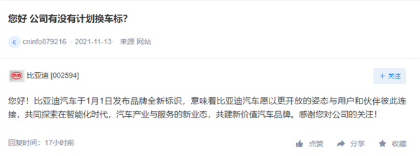 11月18日早間消息,在昨日與投資人在互動平臺交流時,有提問“公司有沒有計劃換車標(biāo)?”。 對此,比亞迪方面回應(yīng)表示,“比亞迪汽車于1月1日發(fā)布品牌全新標(biāo)識,意味著比亞迪汽車愿以更開放的姿態(tài)與用戶和伙伴彼此連接,共同探索在智能化時代,汽車產(chǎn)業(yè)與服務(wù)的新業(yè)態(tài),共建新價值汽車品牌。” 原來,今年1月1日,比亞迪才發(fā)布了全新的品牌標(biāo)識,取消了橢圓型邊界,寓意比亞迪將秉承更加開放的理念,并通過字母變形打開了BYD三個字母封閉空間,讓線條末端如同開放的觸點(diǎn)。 根據(jù)官方表述,全新標(biāo)識與比亞迪集團(tuán)LOGO及“Build Your Dreams(成就夢想)”寓意一脈相承,以簡約流暢的金屬質(zhì)感線條,構(gòu)成極具“向前”動感的“BYD”字樣。通過比例精確、富有規(guī)律的線條排列和變形,賦予新LOGO強(qiáng)烈的設(shè)計感、科技感和品質(zhì)感。 當(dāng)然,由于比亞迪要推出高端品牌,也不排除為高端品牌啟用新車標(biāo)的可能。日前,比亞迪汽車高端品牌籌備辦公室主任趙長江暗示系列會包含一款7座MPV車型。 更早時候,比亞迪汽車品牌及公關(guān)事業(yè)部總經(jīng)理李云飛表示,高端品牌將于今年第四季度正式發(fā)布。他透露,預(yù)計車價區(qū)間在50-80萬,“足以讓人第一眼看見,眼睛就不想離開”。 據(jù)悉,今年前三季度比亞迪實(shí)現(xiàn)營業(yè)收入1451.92億元,同比增長38.25%。 |