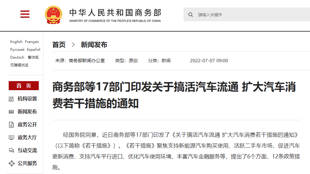 7月7日上午,國(guó)務(wù)院新聞辦公室舉行國(guó)務(wù)院政策例行吹風(fēng)會(huì),商務(wù)部副部長(zhǎng)盛秋平和工業(yè)和信息化部、住房城鄉(xiāng)建設(shè)部有關(guān)負(fù)責(zé)人介紹穩(wěn)定增加汽車消費(fèi)有關(guān)工作,并答記者問(wèn)。 商務(wù)部副部長(zhǎng)盛秋平在國(guó)新辦新聞發(fā)布會(huì)上表示,經(jīng)國(guó)務(wù)院同意,商務(wù)部會(huì)同16部門出臺(tái)搞活汽車流通、擴(kuò)大汽車消費(fèi)的政策措施: 一是對(duì)國(guó)務(wù)院《扎實(shí)穩(wěn)住經(jīng)濟(jì)的一攬子政策措施》中穩(wěn)定增加汽車消費(fèi)相關(guān)政策措施的細(xì)化落實(shí)。 二是針對(duì)新能源汽車市場(chǎng)存在地方保護(hù)、車輛充電不夠便利,二手車市場(chǎng)“小散弱”、交易登記有待優(yōu)化等問(wèn)題,提出更多針對(duì)性強(qiáng)、務(wù)實(shí)管用的有力舉措,力求通過(guò)政策靠前發(fā)力、適當(dāng)加力,進(jìn)一步促進(jìn)汽車市場(chǎng)潛力釋放。 隨著疫情得到有效控制和各項(xiàng)政策措施發(fā)力見(jiàn)效,汽車消費(fèi)將持續(xù)回穩(wěn)復(fù)蘇,下半年汽車消費(fèi)有望實(shí)現(xiàn)較快增長(zhǎng),為穩(wěn)定宏觀經(jīng)濟(jì)大盤發(fā)揮積極作用。 17部門發(fā)文促進(jìn)汽車消費(fèi) 近日商務(wù)部等17部門印發(fā)了《關(guān)于搞活汽車流通 擴(kuò)大汽車消費(fèi)若干措施的通知》。聚焦支持新能源汽車購(gòu)買使用、活躍二手車市場(chǎng)、促進(jìn)汽車更新消費(fèi)、支持汽車平行進(jìn)口、優(yōu)化汽車使用環(huán)境、豐富汽車金融服務(wù)等。 支持新能源汽車消費(fèi) 研究免征新能源汽車車輛購(gòu)置稅政策到期后延期問(wèn)題 《通知》提出,促進(jìn)跨區(qū)域自由流通,破除新能源汽車市場(chǎng)地方保護(hù),各地區(qū)不得設(shè)定本地新能源汽車車型備案目錄,不得對(duì)新能源汽車產(chǎn)品銷售及消費(fèi)補(bǔ)貼設(shè)定不合理車輛參數(shù)指標(biāo)。 支持新能源汽車消費(fèi),研究免征新能源汽車車輛購(gòu)置稅政策到期后延期問(wèn)題。深入開(kāi)展新能源汽車下鄉(xiāng)活動(dòng),鼓勵(lì)有條件的地方出臺(tái)下鄉(xiāng)支持政策,引導(dǎo)企業(yè)加大活動(dòng)優(yōu)惠力度,促進(jìn)農(nóng)村地區(qū)新能源汽車消費(fèi)使用。 加快推進(jìn)居住社區(qū)、停車場(chǎng)、加油站、高速公路服務(wù)區(qū)等充電設(shè)施建設(shè) 《通知》還提出,積極支持充電設(shè)施建設(shè),加快推進(jìn)居住社區(qū)、停車場(chǎng)、加油站、高速公路服務(wù)區(qū)、客貨運(yùn)樞紐等充電設(shè)施建設(shè),引導(dǎo)充電樁運(yùn)營(yíng)企業(yè)適當(dāng)下調(diào)充電服務(wù)費(fèi)。 取消對(duì)開(kāi)展二手車經(jīng)銷的不合理限制 支持汽車整車進(jìn)口口岸地區(qū)開(kāi)展汽車平行進(jìn)口業(yè)務(wù),經(jīng)省級(jí)人民政府批準(zhǔn)汽車平行進(jìn)口工作方案并報(bào)商務(wù)部備案,汽車整車進(jìn)口口岸即可開(kāi)展汽車平行進(jìn)口業(yè)務(wù)。完善平行進(jìn)口汽車強(qiáng)制性產(chǎn)品認(rèn)證和信息公開(kāi)制度,允許企業(yè)對(duì)進(jìn)口車型持續(xù)符合國(guó)六排放標(biāo)準(zhǔn)作出承諾,在環(huán)保信息公開(kāi)環(huán)節(jié),延續(xù)執(zhí)行對(duì)平行進(jìn)口汽車車載診斷系統(tǒng)(OBD)試驗(yàn)和數(shù)據(jù)信息的有關(guān)政策要求。 鼓勵(lì)各地綜合運(yùn)用經(jīng)濟(jì)、技術(shù)等手段推動(dòng)老舊車輛退出 加快老舊車輛淘汰更新 鼓勵(lì)各地綜合運(yùn)用經(jīng)濟(jì)、技術(shù)等手段推動(dòng)老舊車輛退出,有條件的地區(qū)可以開(kāi)展汽車以舊換新,加快老舊車輛淘汰更新。完善報(bào)廢機(jī)動(dòng)車回收利用體系,支持符合條件的企業(yè)獲得報(bào)廢機(jī)動(dòng)車回收資質(zhì)。對(duì)《報(bào)廢機(jī)動(dòng)車回收管理辦法實(shí)施細(xì)則》施行前已取得資質(zhì)的企業(yè),如因新冠肺炎疫情影響無(wú)法按期重新完成資質(zhì)認(rèn)定的,可延期到2023年3月1日。 加大對(duì)報(bào)廢機(jī)動(dòng)車回收企業(yè)建設(shè)項(xiàng)目用地支持力度,企業(yè)建設(shè)項(xiàng)目用地性質(zhì)原則上應(yīng)為工業(yè)用地,對(duì)已取得報(bào)廢機(jī)動(dòng)車回收資質(zhì)的企業(yè)及本文件印發(fā)后3個(gè)月內(nèi)獲得用地審批或建設(shè)工程規(guī)劃許可的在建項(xiàng)目,按已確定的用途使用土地。 加大汽車消費(fèi)信貸支持 《通知》提出,鼓勵(lì)金融機(jī)構(gòu)在依法合規(guī)、風(fēng)險(xiǎn)可控的前提下,合理確定首付比例、貸款利率、還款期限,加大汽車消費(fèi)信貸支持。有序發(fā)展汽車融資租賃,鼓勵(lì)汽車生產(chǎn)企業(yè)、銷售企業(yè)與融資租賃企業(yè)加強(qiáng)合作,增加金融服務(wù)供給。 商務(wù)部等17部門關(guān)于搞活汽車流通 擴(kuò)大汽車消費(fèi)若干措施的通知 商消費(fèi)發(fā)〔2022〕92號(hào) 各省、自治區(qū)、直轄市人民政府,新疆生產(chǎn)建設(shè)兵團(tuán): 汽車業(yè)是國(guó)民經(jīng)濟(jì)的戰(zhàn)略性、支柱性產(chǎn)業(yè)。為進(jìn)一步搞活汽車流通,擴(kuò)大汽車消費(fèi),助力穩(wěn)