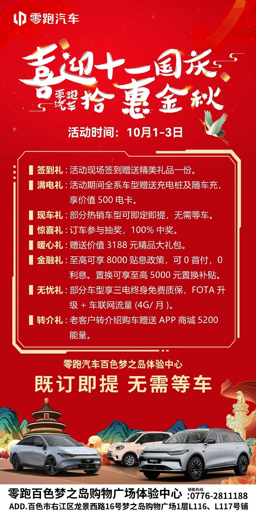 “金九銀十購車季”國慶車展,零跑汽車等你來! 錦繡中華 盛世華誕 ·喜迎國慶· 好消息!好消息! “金九銀十購車季”國慶車展重磅來襲。。 10月1日至3日金九銀十購車季金秋盛典、鉅惠來襲、讓利狂歡!,不容錯(cuò)過!如果您想買車、換車,千萬別錯(cuò)過了! 金九銀十購車季-百色站 零跑汽車的準(zhǔn)車主們 10月1日-10月3日 即將在愛琴海購物廣場(chǎng)隆重開啟! 車展期間到現(xiàn)場(chǎng)或店里購車賞車均享八重豪禮 簽到禮:活動(dòng)現(xiàn)場(chǎng)簽到贈(zèng)送精美禮品一份。 滿電禮:活動(dòng)期間全系車型贈(zèng)送充電樁及隨車充,享價(jià)值500電卡。 現(xiàn)車禮:部分熱銷車型可即定即提,無需等車。 驚喜禮:訂車參與抽獎(jiǎng),100%中獎(jiǎng)。 暖心禮:贈(zèng)送價(jià)值3188元精品大禮包。 金融禮:至高可享8000貼息政策,可0首付,0利息。置換可享至高5000元置換補(bǔ)貼。 無憂禮:部分車型享三電終身免費(fèi)質(zhì)保,F(xiàn)OTA升級(jí)+車聯(lián)網(wǎng)流量(4G/月)。 轉(zhuǎn)介禮:老客戶轉(zhuǎn)介紹購車贈(zèng)送APP商城5200能量。 到現(xiàn)場(chǎng)看車、選車完全實(shí)現(xiàn)一站式服務(wù)不需要再東奔西跑有購車計(jì)劃的你, 再等等國慶假期到愛琴海購物廣場(chǎng) 零跑汽車等你來~ |