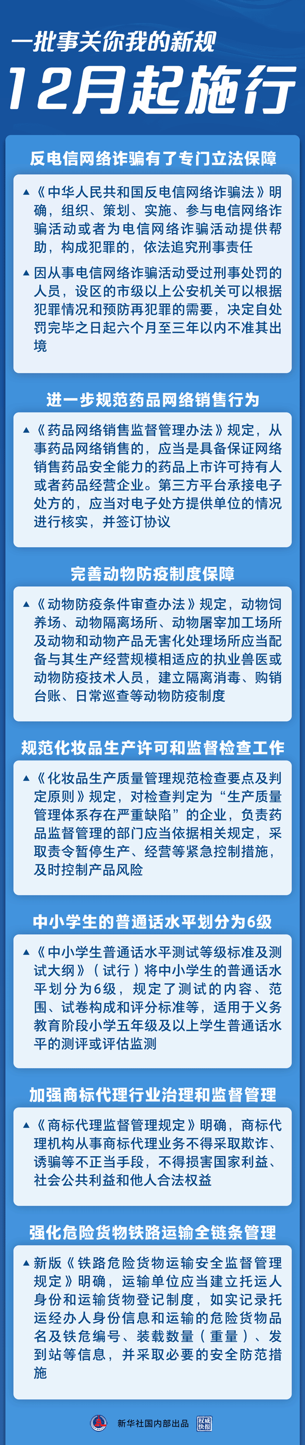 新華社北京11月30日電題:12月,一批事關(guān)你我的新規(guī)開始施行 新華社記者白陽 2022年的最后一個月,一批事關(guān)你我的新規(guī)開始施行。反電信網(wǎng)絡(luò)詐騙有了專門立法保障,中小學(xué)生的普通話水平有了規(guī)范標(biāo)準(zhǔn),藥品網(wǎng)絡(luò)銷售平臺責(zé)任進(jìn)一步壓實(shí)……法治,為美好生活助力。 為懲治電信網(wǎng)絡(luò)詐騙“精準(zhǔn)出招” 《中華人民共和國反電信網(wǎng)絡(luò)詐騙法》自2022年12月1日起施行。 反電信網(wǎng)絡(luò)詐騙法從人員鏈、信息鏈、技術(shù)鏈、資金鏈等進(jìn)行全鏈條治理,從前端宣傳預(yù)防、中端監(jiān)測處置、后端懲治進(jìn)行全流程治理,強(qiáng)化部門監(jiān)管主體責(zé)任,壓實(shí)企業(yè)責(zé)任,對電詐分子規(guī)定了有效預(yù)防懲處措施,嚴(yán)厲打擊各類涉詐黑灰產(chǎn)行為。 反電信網(wǎng)絡(luò)詐騙法規(guī)定,公安機(jī)關(guān)要會同有關(guān)部門、企業(yè)建立預(yù)警勸阻系統(tǒng),對發(fā)現(xiàn)的潛在被害人及時采取相應(yīng)勸阻措施。 對前往涉詐嚴(yán)重地區(qū)且出境活動存在重大涉詐嫌疑的,或者因電信網(wǎng)絡(luò)詐騙受過刑事處罰的,反電信網(wǎng)絡(luò)詐騙法規(guī)定,可以根據(jù)情況采取出境限制措施。 中小學(xué)生的普通話水平劃分為6級 《中小學(xué)生普通話水平測試等級標(biāo)準(zhǔn)及測試大綱》(試行)自2022年12月15日起試行。該規(guī)范將中小學(xué)生的普通話水平劃分為6級,規(guī)定了測試的內(nèi)容、范圍、試卷構(gòu)成和評分標(biāo)準(zhǔn)等,適用于義務(wù)教育階段小學(xué)五年級及以上學(xué)生普通話水平的測評或評估監(jiān)測。 新修訂的《漢字部首表》也將于2022年12月15日起實(shí)施。在保持原有201個主部首基礎(chǔ)上,增補(bǔ)微調(diào)個別附形部首,并給出部分常用部首名稱和部首的信息處理國際編碼。 壓實(shí)藥品網(wǎng)絡(luò)銷售平臺責(zé)任 《藥品網(wǎng)絡(luò)銷售監(jiān)督管理辦法》自2022年12月1日起施行。 辦法明確了從事藥品網(wǎng)絡(luò)銷售的藥品經(jīng)營企業(yè)主體資格和要求,并依法明確疫苗、血液制品、麻醉藥品、精神藥品等國家實(shí)行特殊管理的藥品不得在網(wǎng)絡(luò)上銷售。 辦法要求對處方藥網(wǎng)絡(luò)銷售實(shí)行實(shí)名制,并按規(guī)定進(jìn)行處方審核調(diào)配;規(guī)定處方藥與非處方藥應(yīng)當(dāng)區(qū)分展示,并明確在處方藥銷售主頁面、首頁面不得直接公開展示包裝、標(biāo)簽等信息;通過處方審核前,不得展示說明書等信息,不得提供處方藥購買的相關(guān)服務(wù)。 規(guī)范化妝品生產(chǎn)許可和監(jiān)督檢查工作 《化妝品生產(chǎn)質(zhì)量管理規(guī)范檢查要點(diǎn)及判定原則》自2022年12月1日起施行。 該原則明確了藥監(jiān)部門開展生產(chǎn)許可現(xiàn)場核查、生產(chǎn)許可延續(xù)后現(xiàn)場核查、日常監(jiān)督檢查的具體情形和相關(guān)判定原則。 對檢查判定為“生產(chǎn)質(zhì)量管理體系存在嚴(yán)重缺陷”的企業(yè),負(fù)責(zé)藥品監(jiān)督管理的部門應(yīng)當(dāng)依據(jù)相關(guān)規(guī)定,采取責(zé)令暫停生產(chǎn)、經(jīng)營等緊急控制措施,及時控制產(chǎn)品風(fēng)險。企業(yè)應(yīng)當(dāng)在規(guī)定的時間內(nèi)完成整改,并向負(fù)責(zé)藥品監(jiān)督管理的部門提交整改報告。 對檢查判定為“生產(chǎn)質(zhì)量管理體系存在嚴(yán)重缺陷”的企業(yè),負(fù)責(zé)藥品監(jiān)督管理的部門應(yīng)當(dāng)根據(jù)相關(guān)規(guī)定立案調(diào)查。 完善商標(biāo)代理行業(yè)治理監(jiān)管 《商標(biāo)代理監(jiān)督管理規(guī)定》自2022年12月1日起施行,針對商標(biāo)代理行業(yè)準(zhǔn)入門檻低、機(jī)構(gòu)過多過濫、經(jīng)營管理不規(guī)范、服務(wù)水平參差不齊等問題細(xì)化監(jiān)管規(guī)定。 規(guī)定要求,商標(biāo)代理機(jī)構(gòu)建立健全業(yè)務(wù)管理制度和業(yè)務(wù)檔案制度,加強(qiáng)從業(yè)人員職業(yè)道德和職業(yè)紀(jì)律教育。商標(biāo)代理機(jī)構(gòu)從事商標(biāo)代理業(yè)務(wù)不得采取欺詐、誘騙等不正當(dāng)手段,不得損害國家利益、社會公共利益和他人合法權(quán)益。 加強(qiáng)鐵路危險貨物運(yùn)輸安全管理 新版《鐵路危險貨物運(yùn)輸安全監(jiān)督管理規(guī)定》自2022年12月1日起施行。 針對非法托運(yùn)危險貨物問題,規(guī)定建立了托運(yùn)人在危險貨物確定品類、防護(hù)措施、專門辦理站點(diǎn)、提交證明材料、運(yùn)單填報、應(yīng)急聯(lián)系等方面制度;針對違規(guī)承運(yùn)危險貨物問題,規(guī)定建立了安全查驗(yàn)、違規(guī)托運(yùn)告知、簽訂安全協(xié)議等制度。 對包裝、數(shù)量、危險物質(zhì)含量等符合要求的危險貨物,如含鋰電池的消費(fèi)類電子產(chǎn)品、含碘小于50%的碘酒、醫(yī)藥用的四氯乙烯等,在滿足一定條件的情況下不作為危險貨物運(yùn)輸。 強(qiáng)化養(yǎng)殖業(yè)生產(chǎn)安全和公共衛(wèi)生安全 新版《動物檢疫管理辦法》和《動物防疫條件審查辦法》自2022年12月1日起施行。 新版《動物檢疫管理辦法》明確農(nóng)業(yè